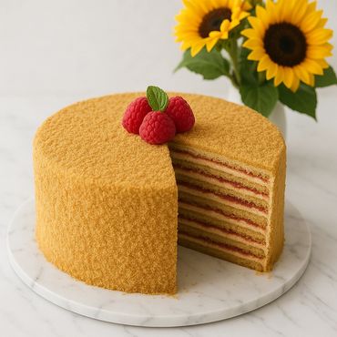 Honey Cakes are made with thin layers of honey-infused sponge and creamy filling, offering a perfect balance of rich flavor and delicate sweetness. A traditional favorite with a soft, melt-in-your-mouth texture. Your choice of filling: caramel, lemon, strawberry, raspberry.