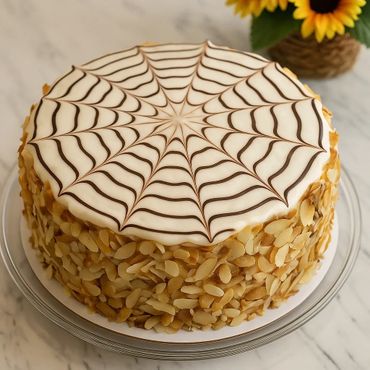 Esterhazy Cake is a classic Hungarian dessertThis elegant layered cake, features delicate almond meringue layers filled with a rich, velvety buttercream flavored with vanilla and cognac. Its signature look is a glossy white chocolate with a distinctive chocolate feathered pattern on top, making it both visually striking and decadently delicious. It’s a beloved choice for celebrations, offering a sophisticated blend of nutty sweetness and creamy texture.